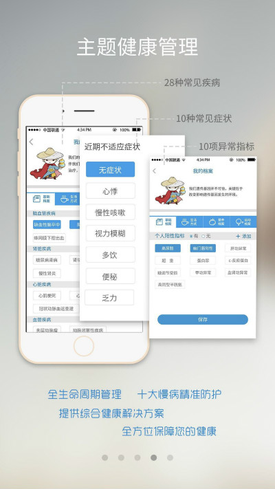 主題健康管理:13種重大疾病風(fēng)險評估和監(jiān)測指導(dǎo),60種常見高發(fā)疾病反饋,28個主題疾病個性化服務(wù),10種常見癥狀指導(dǎo),健康計劃,健康營養(yǎng)運動處方針對明確,只要你參與,只要你執(zhí)行,你的健康你做主。