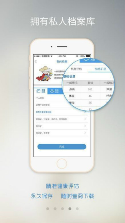 擁有私人檔案庫:行業(yè)內(nèi)最全面的健康動態(tài)檔案和健康問題專項解讀,精準(zhǔn)健康評估,永久保存,隨時查閱下載,成為自己數(shù)據(jù)的主人。