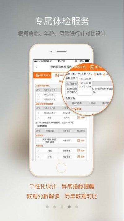 專屬個人數(shù)據(jù)管理:根據(jù)個人關(guān)注指定顯示健康指標(biāo)動態(tài),可以根據(jù)年齡、病癥、風(fēng)險針對性服務(wù),實現(xiàn)專屬體檢設(shè)計、檢查提醒、日常數(shù)據(jù)管理、精準(zhǔn)指標(biāo)解讀以及歷年數(shù)據(jù)分析,為健康維護(hù)和效果提供堅實數(shù)據(jù)基礎(chǔ)。