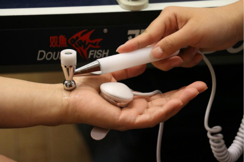 健康管理師在企業(yè)員工進(jìn)行經(jīng)絡(luò)檢測